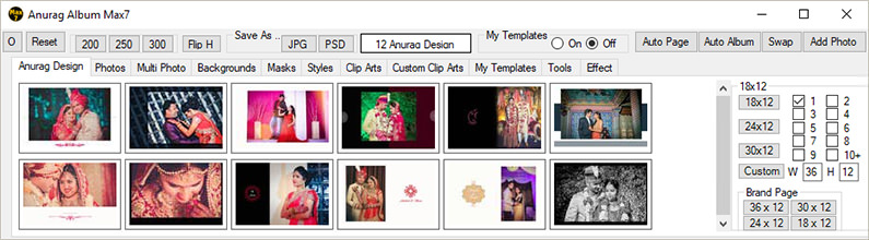 There are 3500+ pre-loaded PSD Templates available in Anurag Album MAX9 with four default sizes 18X12 | 24X12 | 30X12 | 36X12. Alongside, you can create different sized templates using Custom option. Moreover any pre-loaded template can be converted in different sizes. These 3500+ templates are developed for designing wedding & portrait albums.