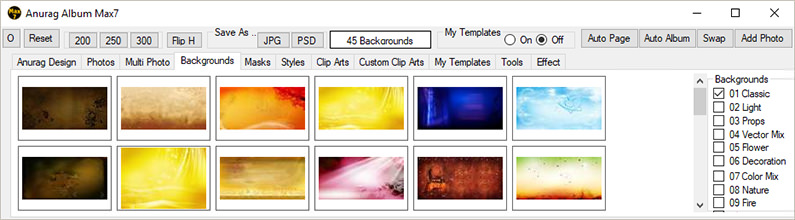 The Backgrounds are necessary stuff for designing wedding and portrait albums. In Anurag Album MAX 8, there are 400+ Backgrounds in different categories like Classic, Light, Decoration, Fire, Flowers etc.
