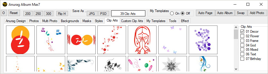 There are 219 Clip Arts available in Anurag Album MAX 8 which are best suitable for decorating and lucrative garnishing of your wedding and portrait albums.