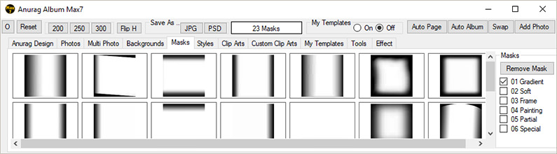A total of 135 Masks in different categories like Gradiant, Soft, Frames, Painting, Partial etc. are loaded in Anurag Album Max9 which is having best selected masks for designing your albums.