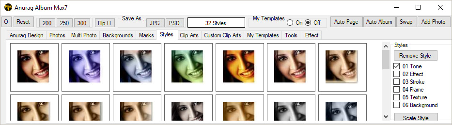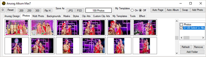 In Anurag Album Max 8, you will get 185+ Styles & Borders for designing wedding and portrait albums. -Add borders or frames to images. -Enhance image with fabulous color tones, effects & textures.