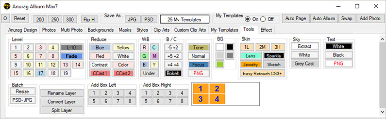 You will get tools for automatic adjustment in Anurag Album MAX 8 for levels (color correction), skin retouching, background change as well as color tones & white balance of your pictures.